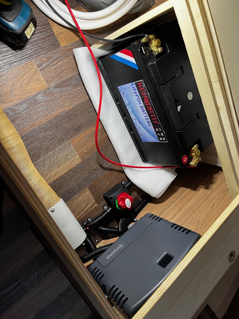 Ook is het mogelijk de accu te laden tijdens het rijden. Bij Victron en onze set 4 zijn de accu’s er al op voorbereid, een aparte lader is dan niet nodig.