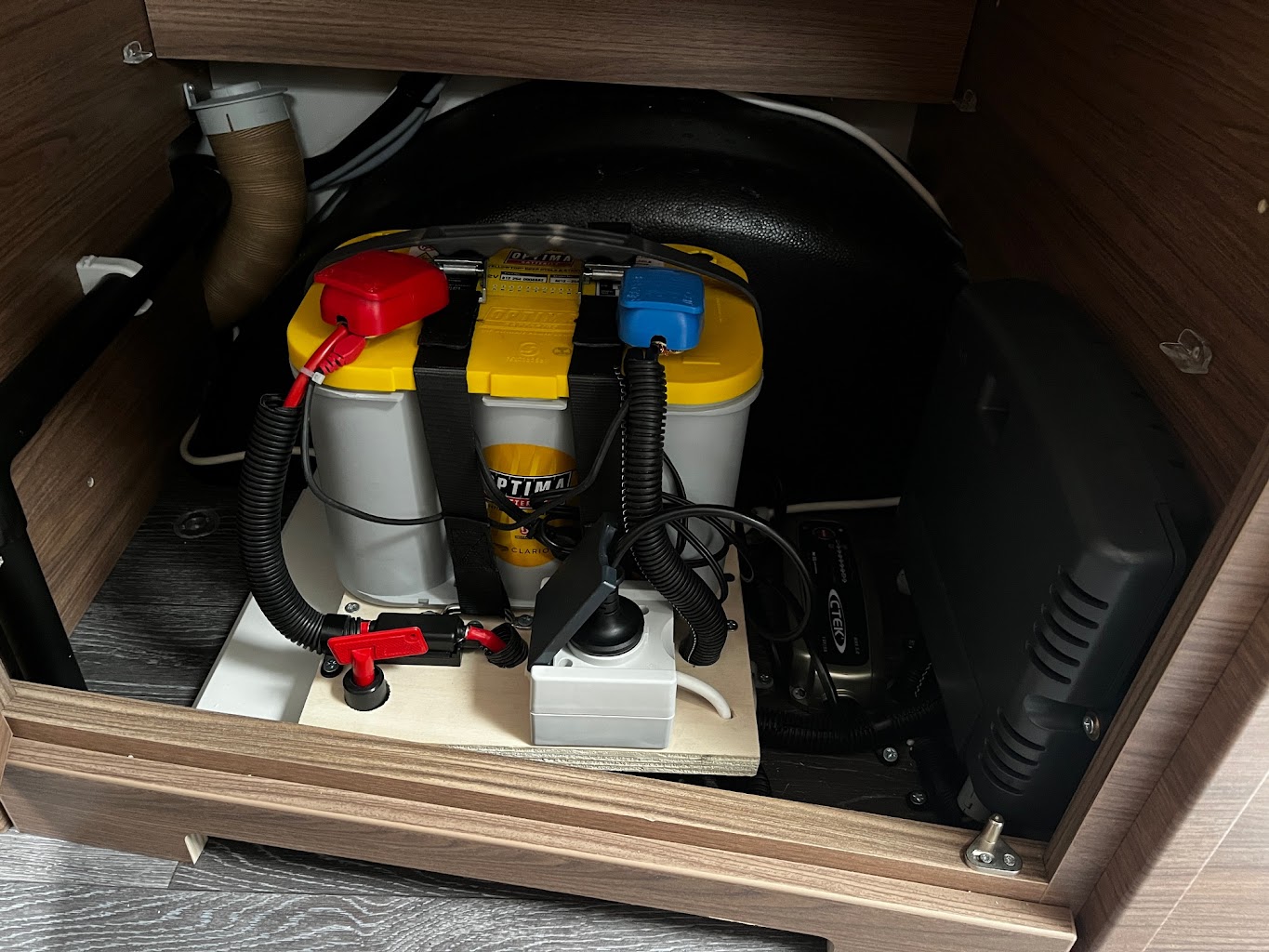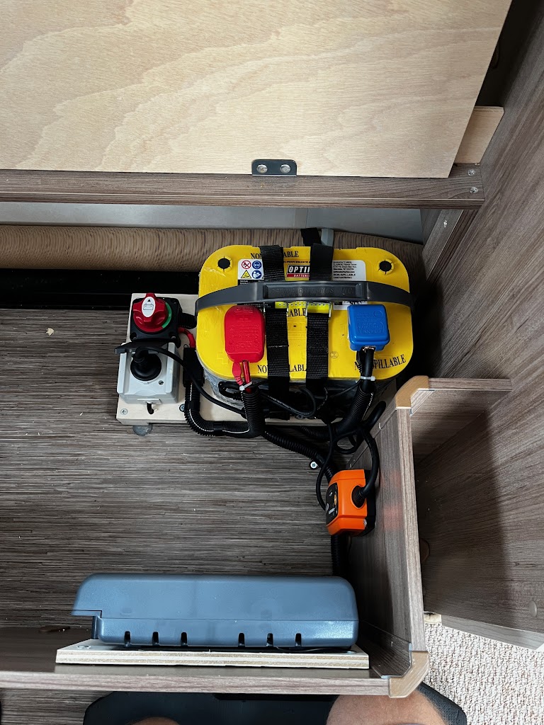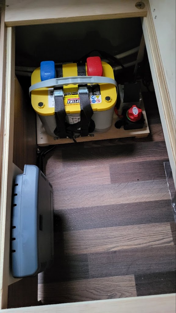 Als de caravan nog niet is uitgerust met een accu moet deze geplaatst worden om de mover van energie te voorzien. Normaal gesproken wordt de accu alleen gebruikt voor de mover. Wij kunnen de accu aansluiten op het boordnet van uw caravan. U kunt de accu dan gebruiken voor 12 Volt toepassingen, zoals de verlichting, kraantjes en het toilet. De aansluiting wordt zo gemaakt dat automatisch de beste energiebron gekozen wordt. Indien er geen 230V aansluiting is en geen auto aangekoppeld is, komt de energie van de mover accu.